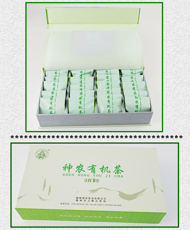 神農(nóng)有機茶系列之——白茶,采用綠茶加工工藝,選一芽二葉初展的白茶嫩葉為原料,經(jīng)殺青、理條、烘干、提香等工藝加工而制成,屬綠茶類。有機白茶外形挺直略扁,形如蘭蕙;色澤翠綠略帶金黃,白毫顯露;葉芽如金鑲碧鞘,內(nèi)裹銀箭。沖泡后,清香高揚且持久,湯色嫩綠明亮,滋味鮮醇、馥郁,清潤甘爽,飲畢,唇齒留香,回味甘而生津。葉底嫩綠明亮,葉白脈翠,芽葉朵朵,十分可人。